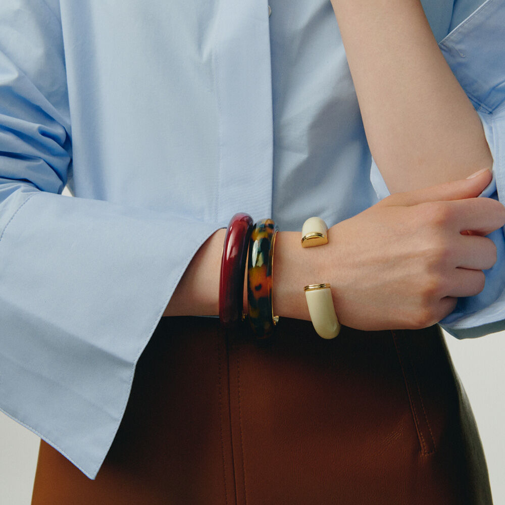 This bangle from our PALAIS ROYAL collection, designed in Paris, is made from brass gilded with 750/1000th – 18-carat gold and acetate.It is available in Bordeaux, Ivory, or Leopard colors.An iconic Agatha product, this bangle adds a touch of color to your outfits.