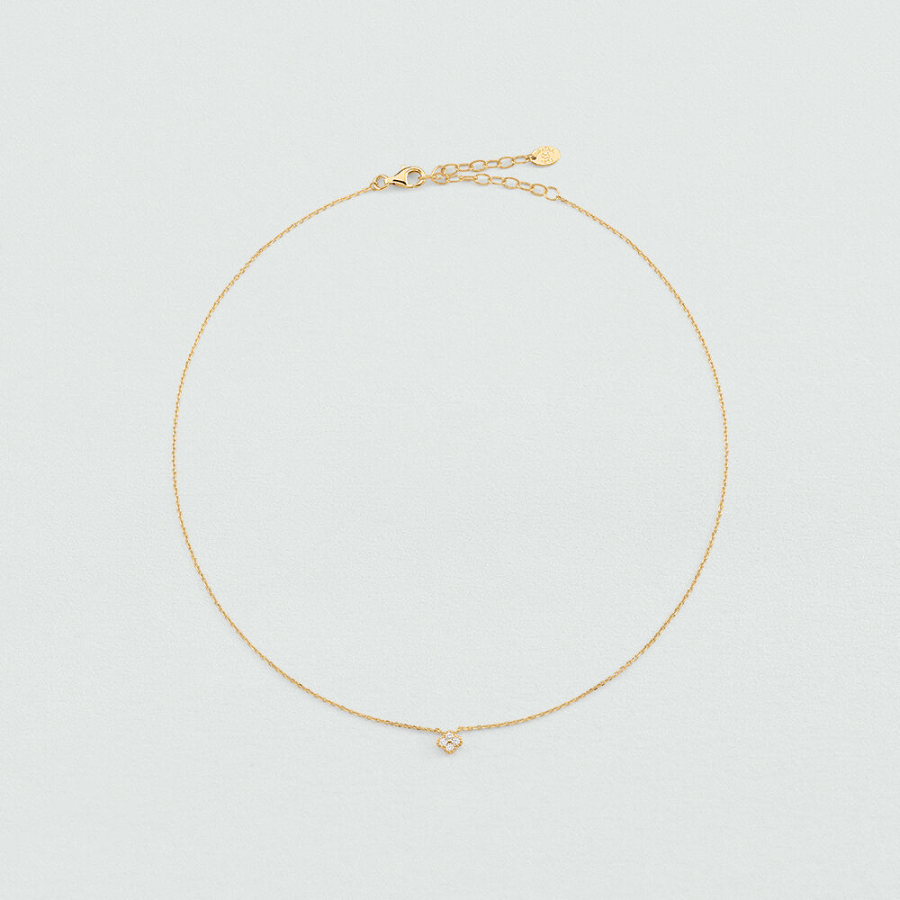 Necklace, in sterling silver with gold plating, with a flower pendant whose petals are made with cubic zirconia and whose edges are with a thin milegrain. This piece of jewelry is 375mm long and comes with a 50mm extender