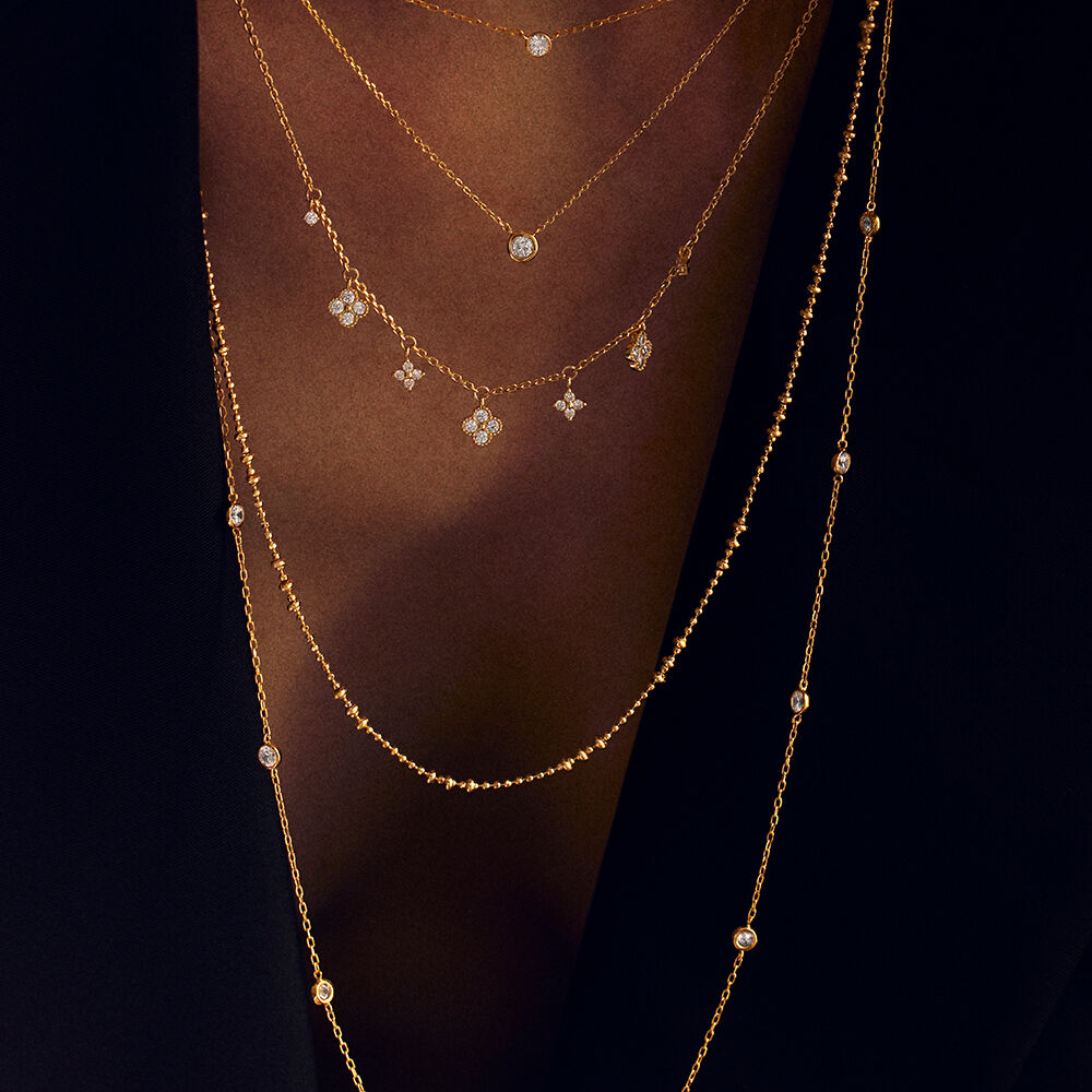 Short necklace, in sterling silver with gold plating, with flowers'charms, whose petals are with cubic zirconia and the edges with a thin milegrain. This piece of jewelry measures 420 mm and has an extender of 50 mm