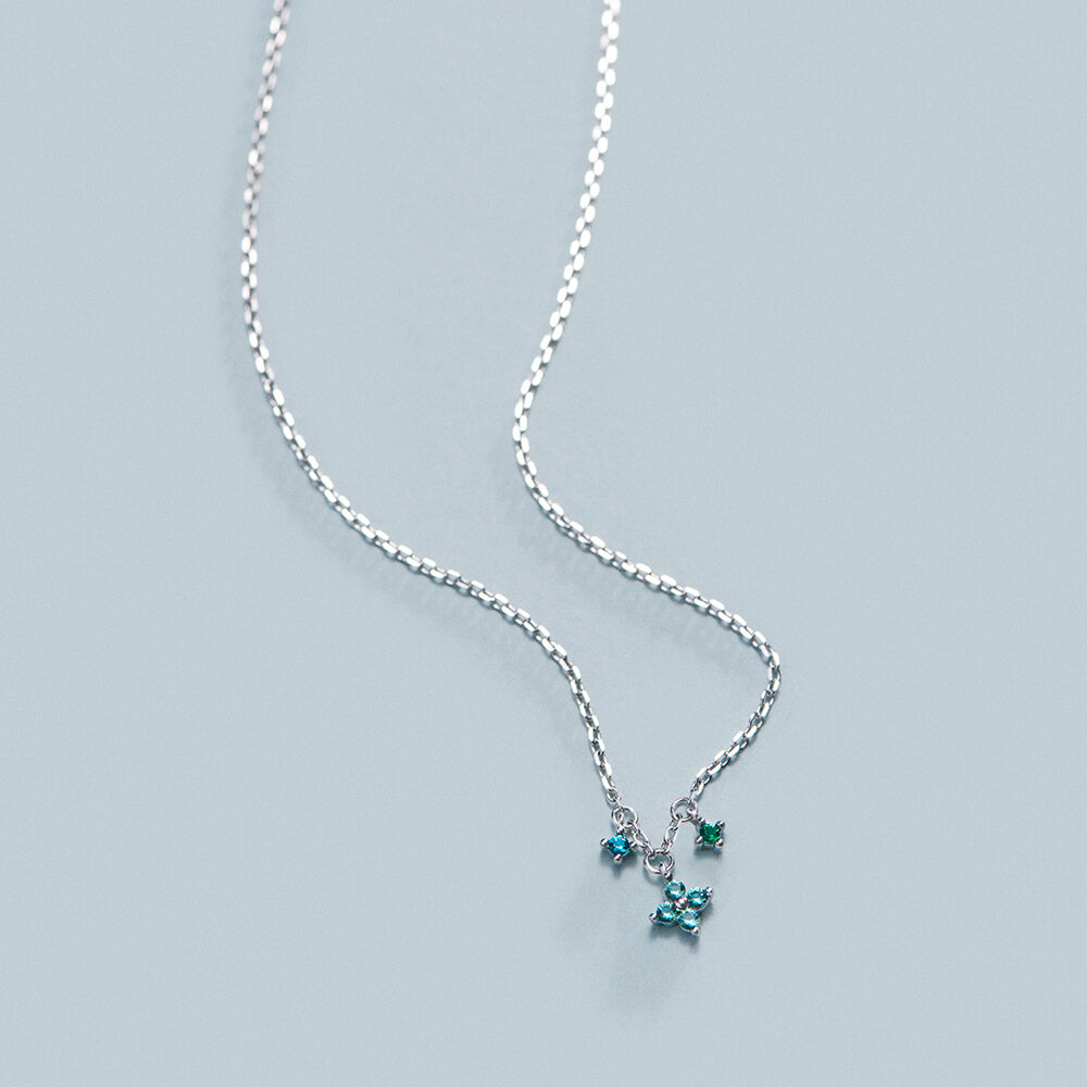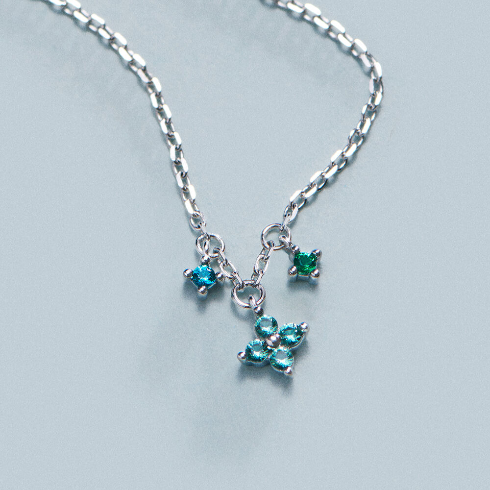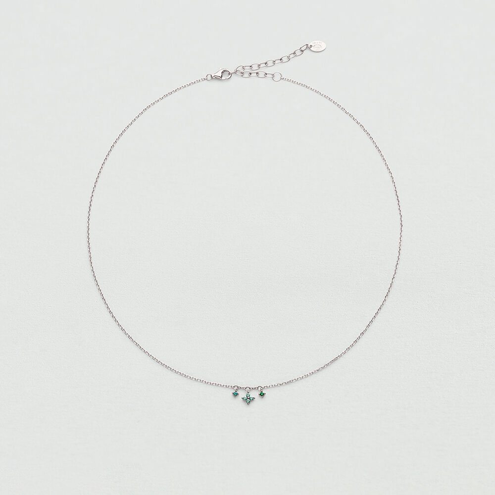 Short necklace in 925/1000 silver with cubic zirconia flowers as pendants.
