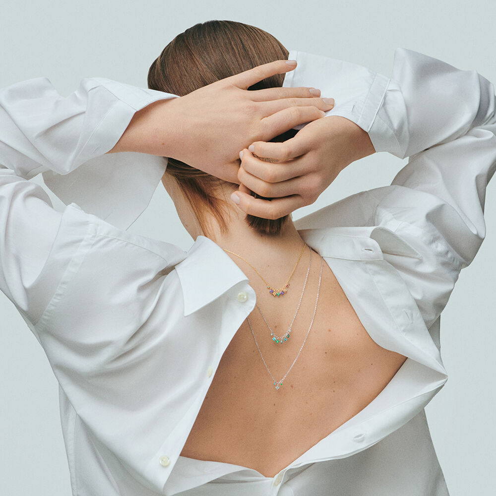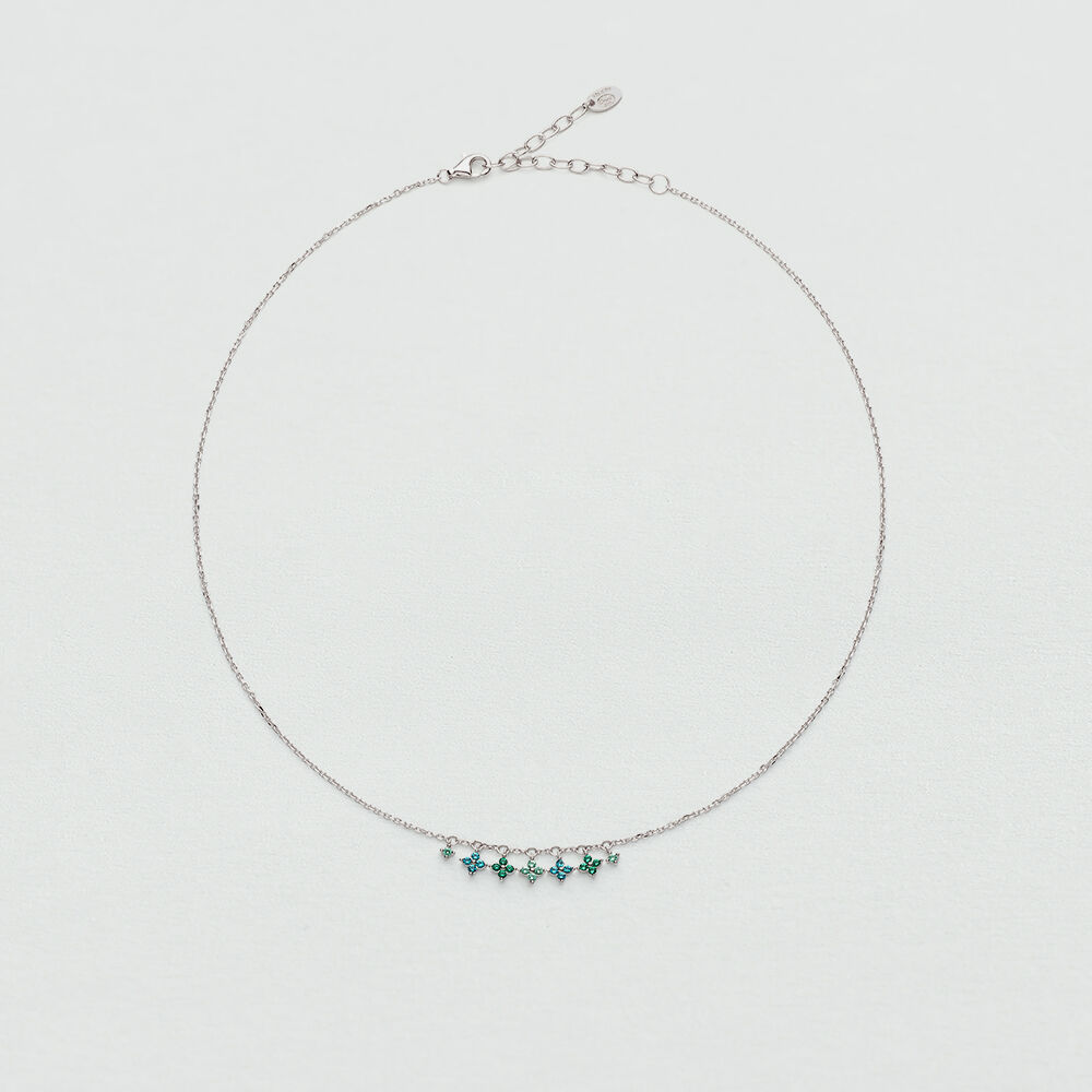 Short necklace in 925/1000 silver with cubic zirconia flowers as pendants.