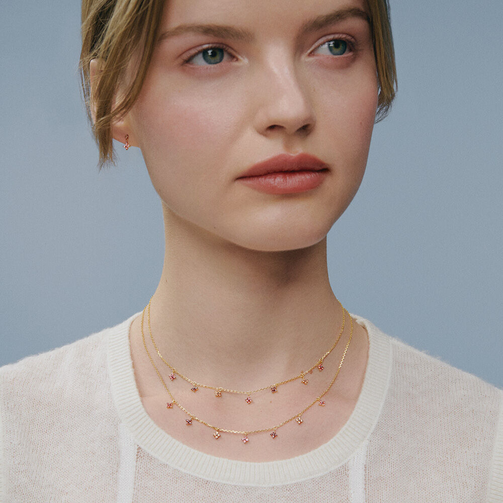 Gold-plated silver necklace set with small flower-shaped pendants made of pink-tinted cubic zirconia. This piece of jewelry measures 375 mm and has an extender of 50 mm