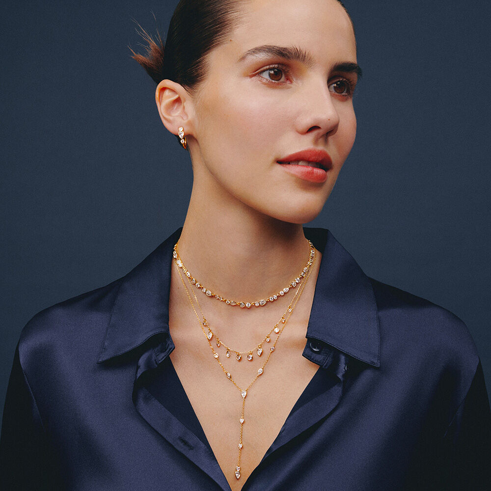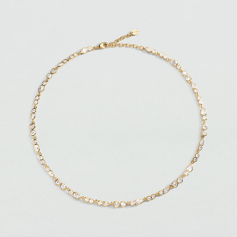 This necklace from our CANDY collection, designed in Paris, is made from 750/1000 gold-plated brass and adorned with zirconium oxides. It is available in multicolored or cristal versions. With its outline adorned with cushion-shaped or teardrop-shaped oxides, this necklace creates a chic yet understated look. It can be paired with other jewellery from our permanent CANDY collection or with our VICTOIRE rings. This piece of jewelry is 375mm long and comes with a 50mm extender