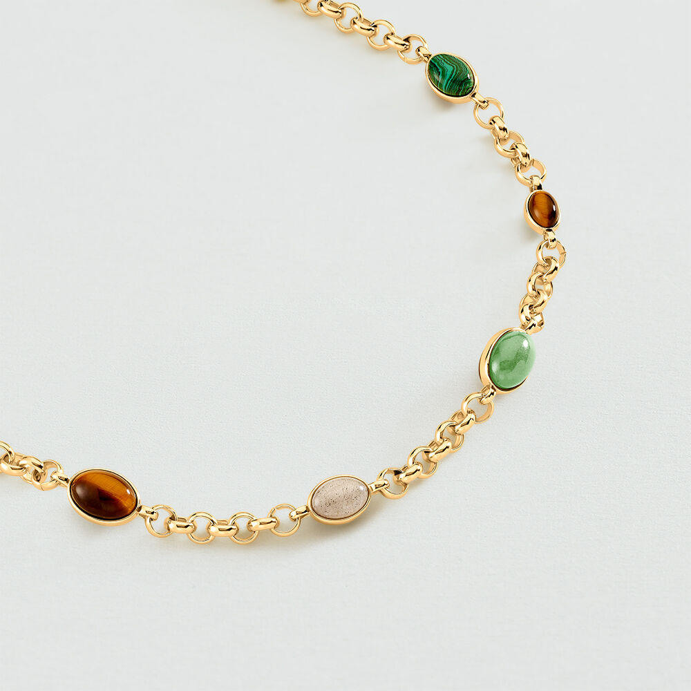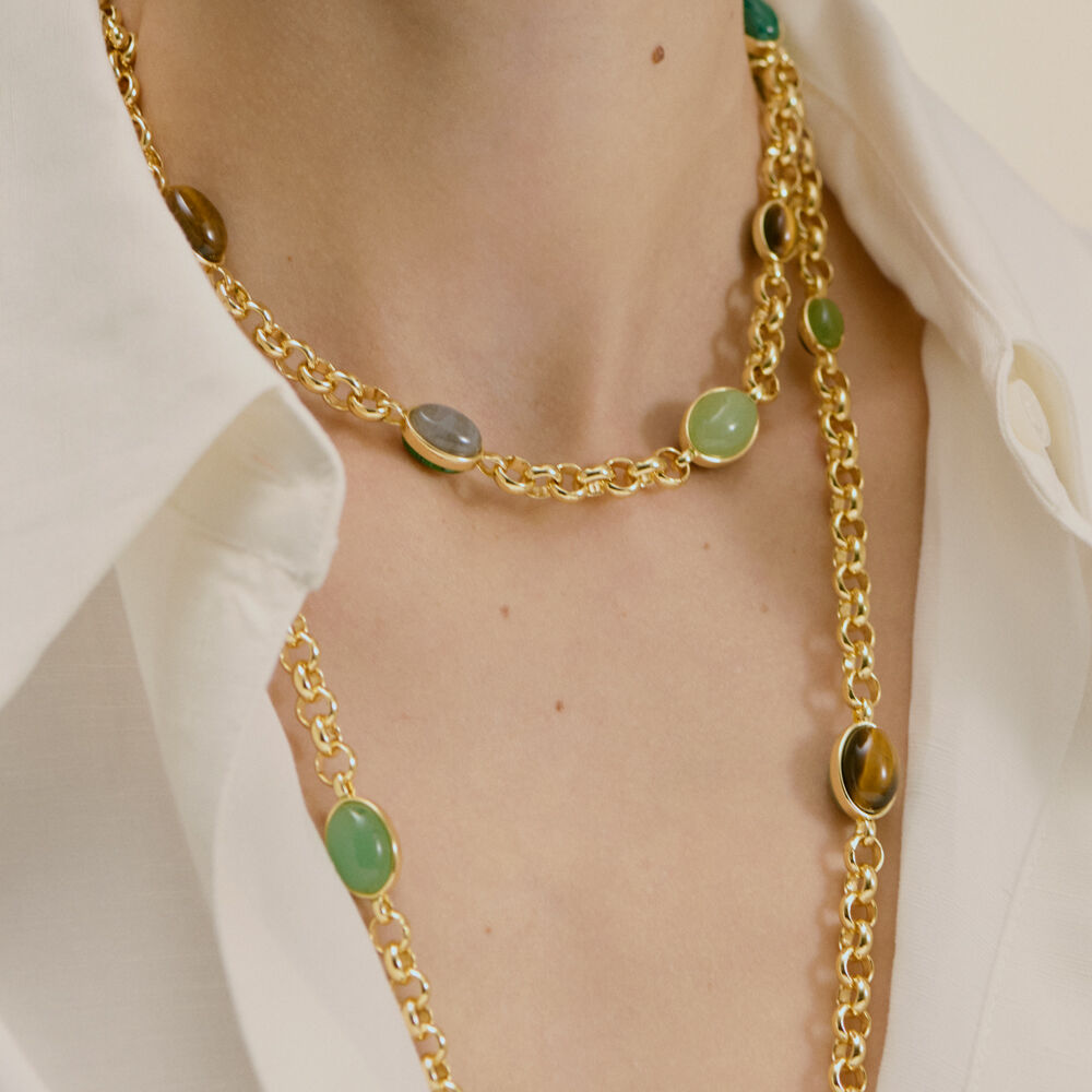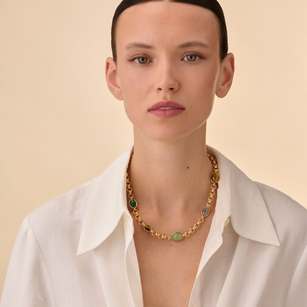 Short necklace, in golden brass, chain with doble side setted natural stones. You can ajust the length thanks to a movible part.