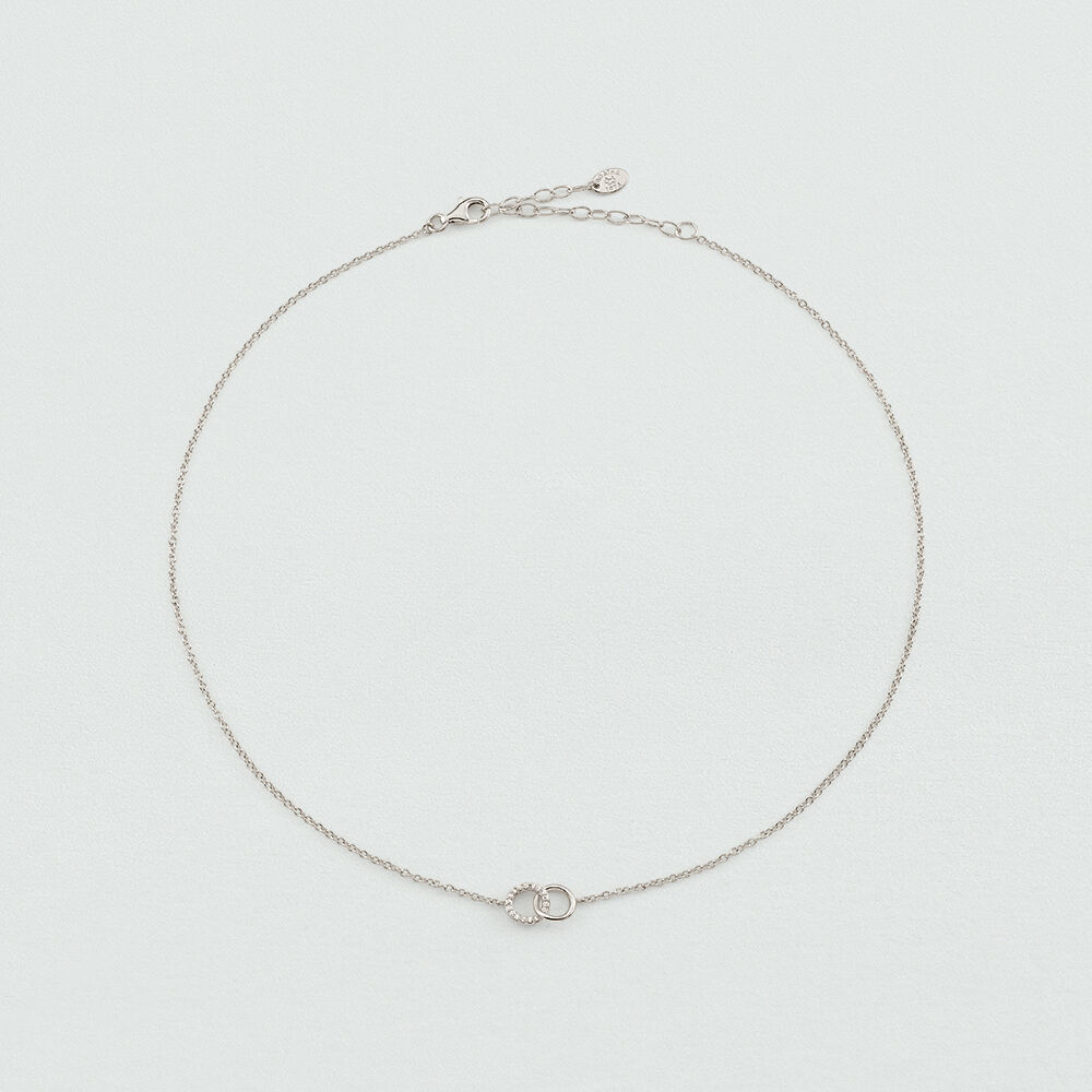 Short necklace with two linked rings, one paved with cubic zirconia, on a thin chain, in sterling silver.. This piece of jewelry is 375mm long and comes with a 50mm extender