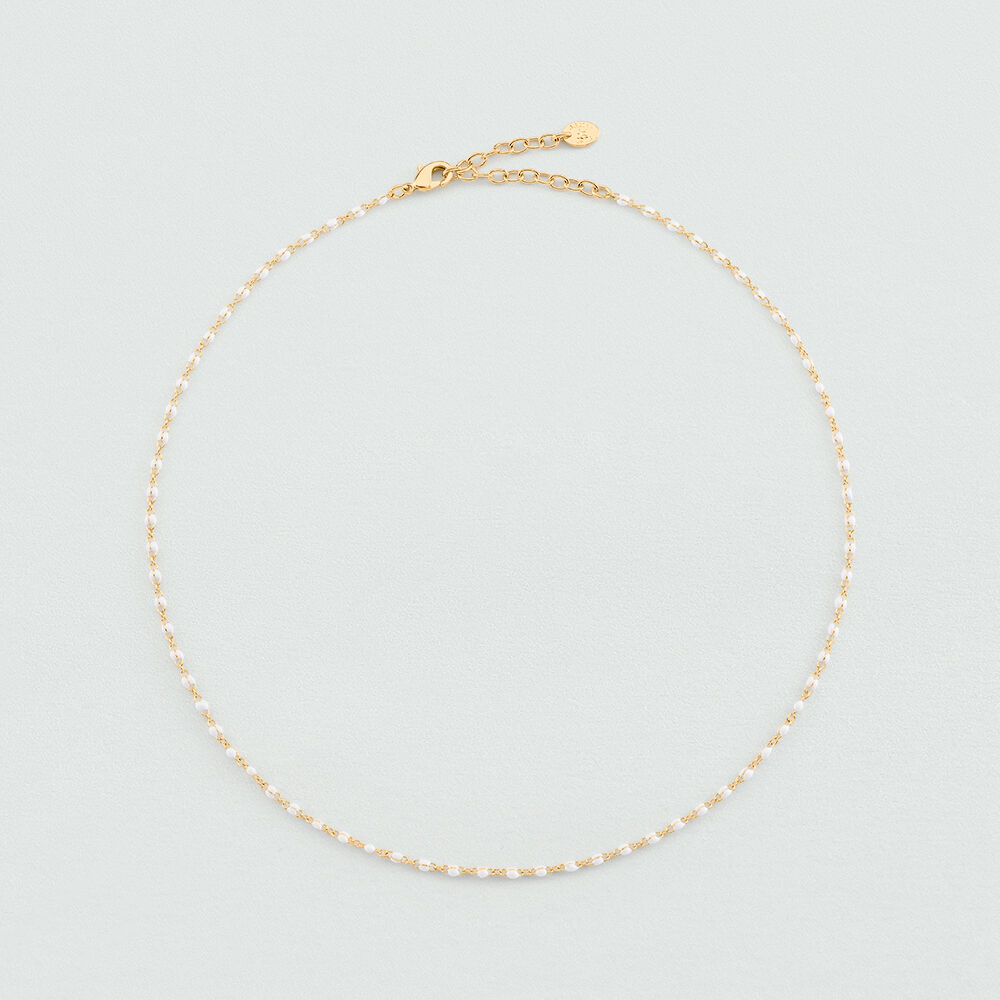 This necklace from our SMARTY collection, designed in Paris, is made of stainless steel gilded with fine gold and adorned with small colored enamel beads. It is available in silver/gold, turquoise, green, burgundy, black, coral, blue or white. A refined piece that adds a touch of elegance to all your outfits. This piece of jewelry is 375mm long and comes with a 50mm extender