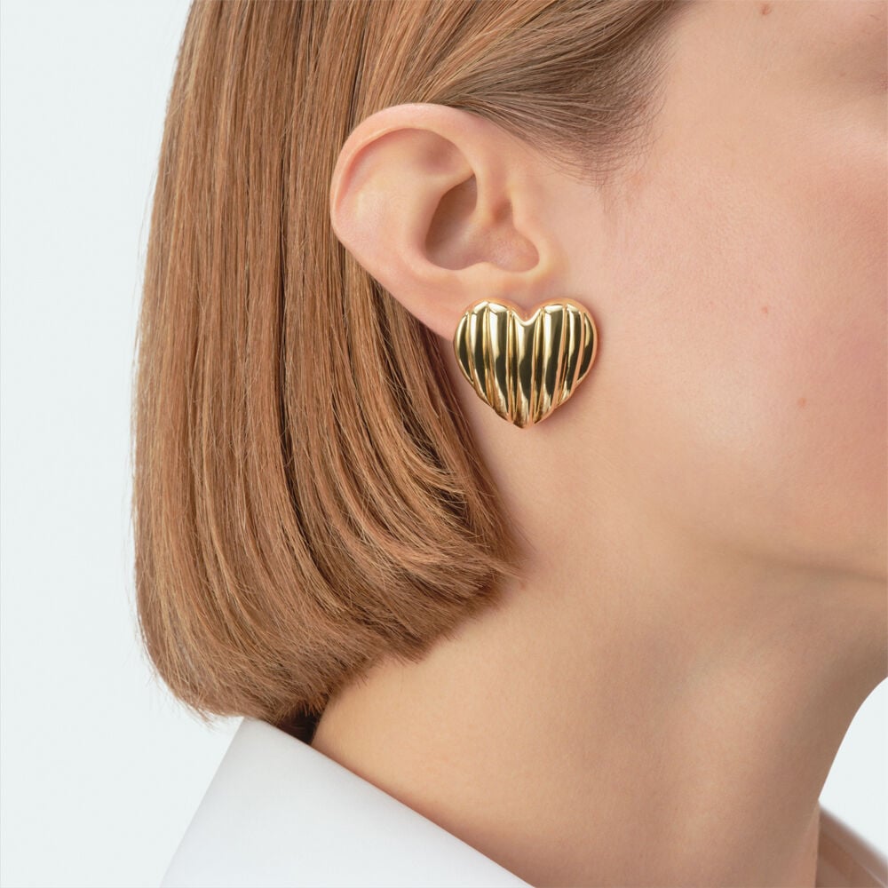 Striated heart clip-on earrings from our SACRE COEUR collection, designed in Paris, made from brass gilded with 750/1000th - 18 carat gold. Earrings for non-pierced ears with clip-on fastening.