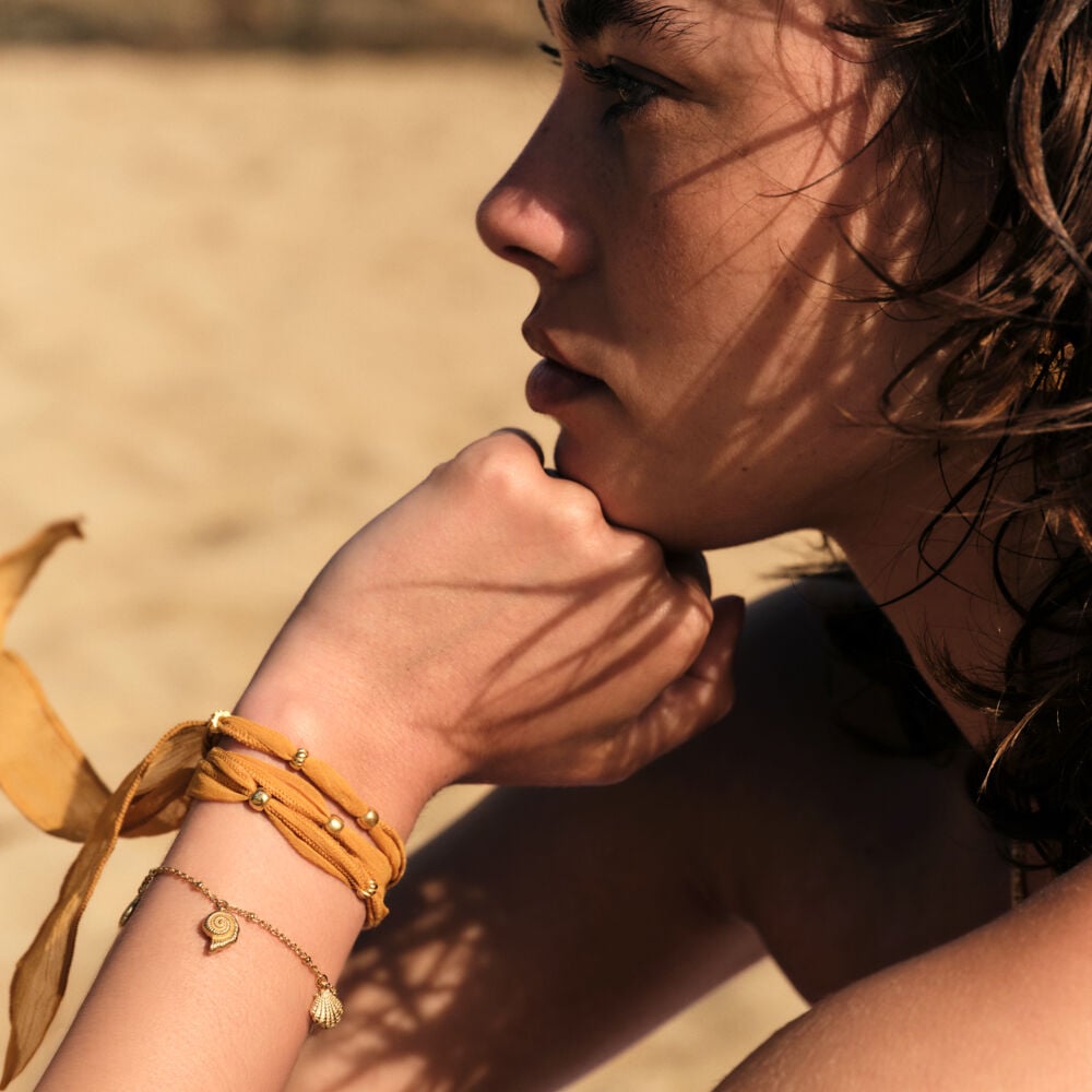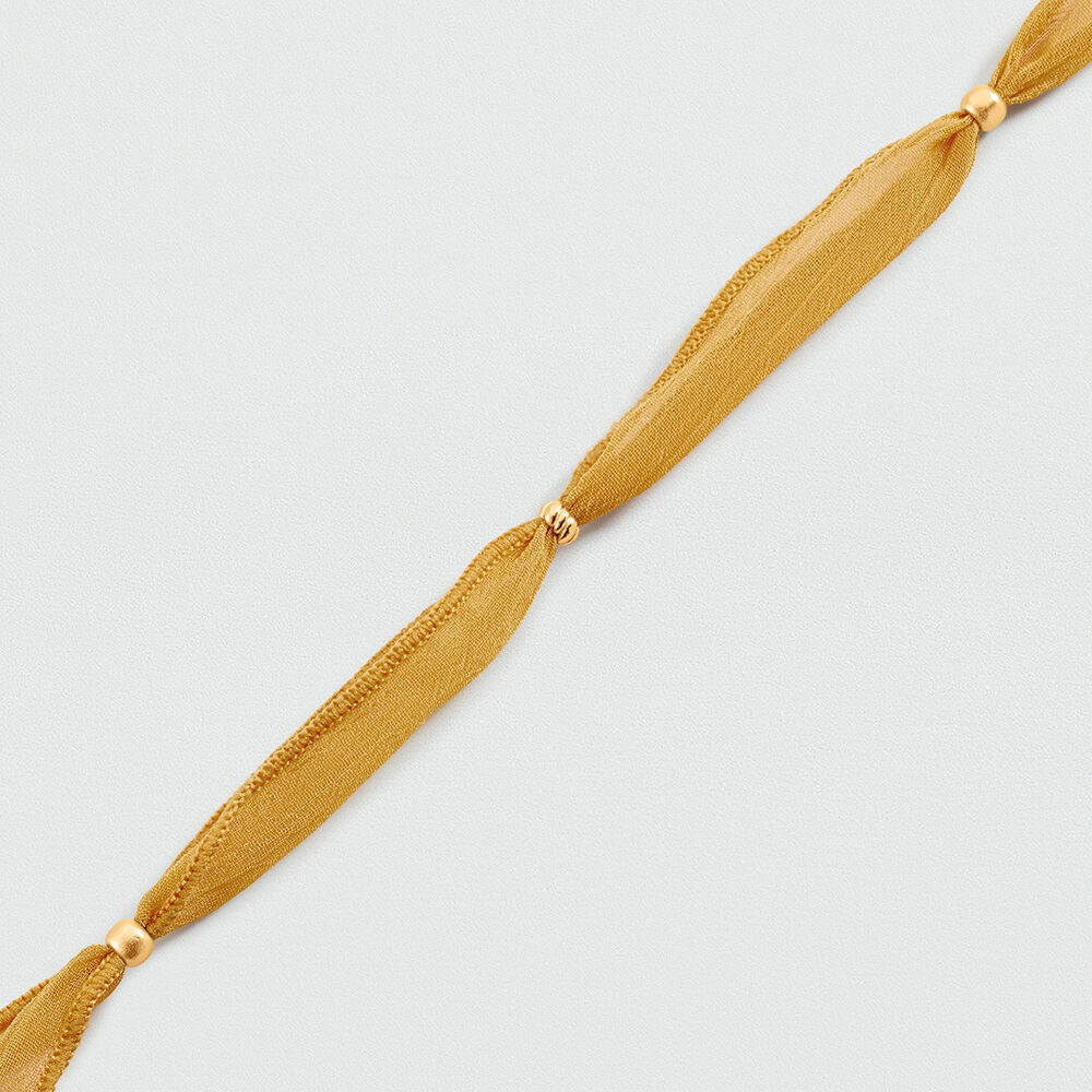 Colorful silk bracelet with gold-finished beads. Perfect for stacking and adding an irresistible boho chic vibe to all your summer looks. You won’t want to take it off!.