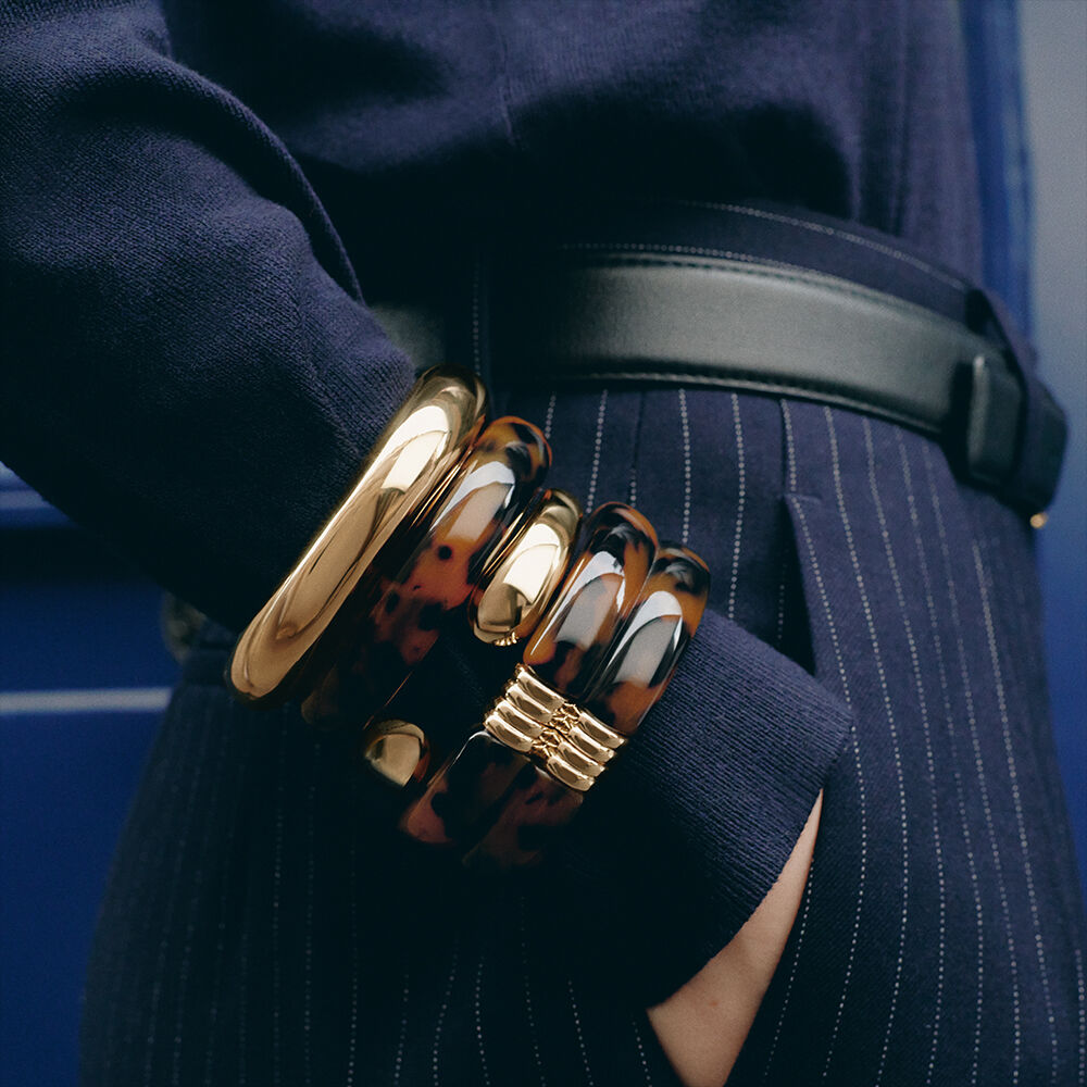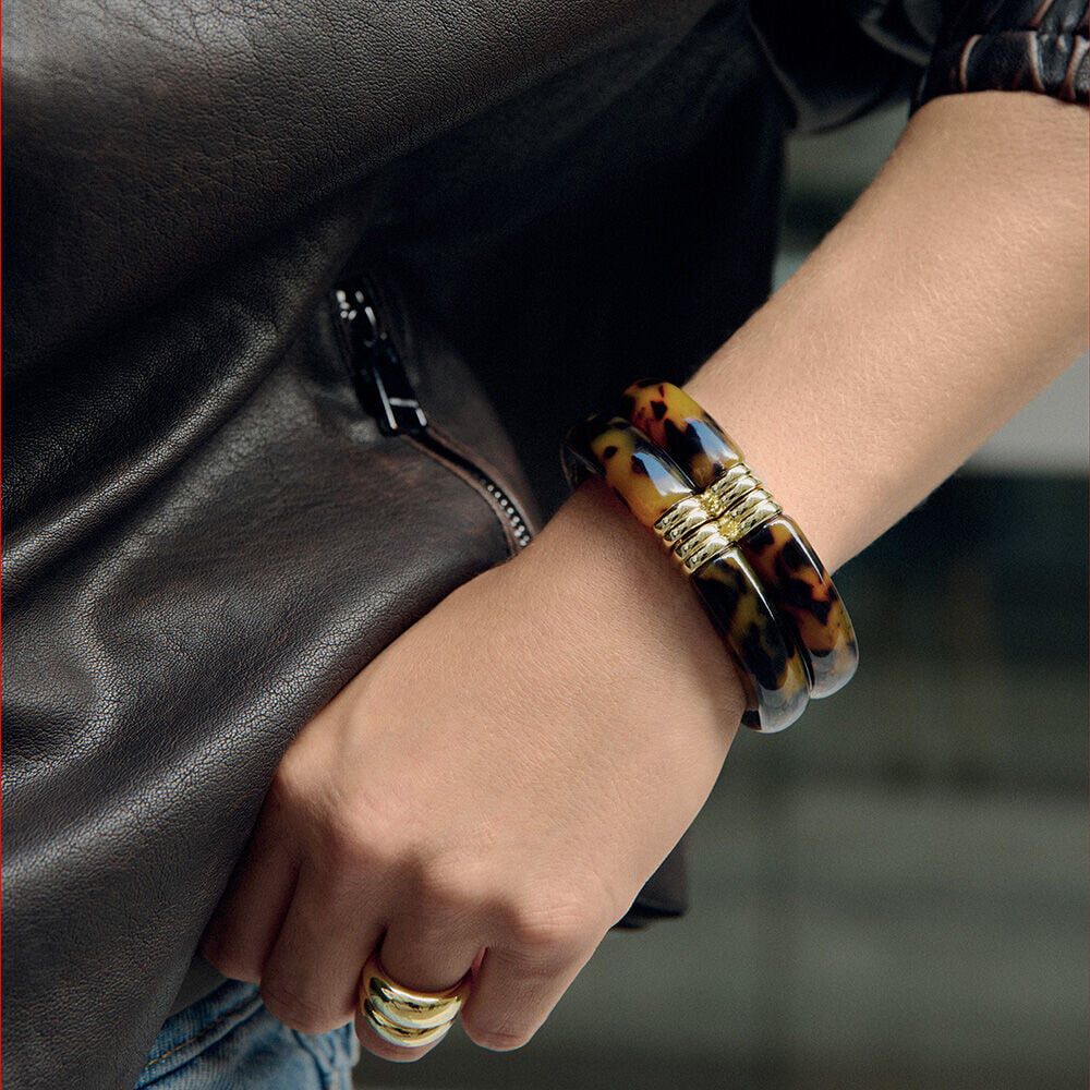 This cuff bracelet from our PALAIS ROYAL collection, designed in Paris, is made from 750/1000th gold-plated brass (18 carats) and acetate. It is hinged for easy slip-on wear. It is available in Bordeaux, Red and Leopard colors.