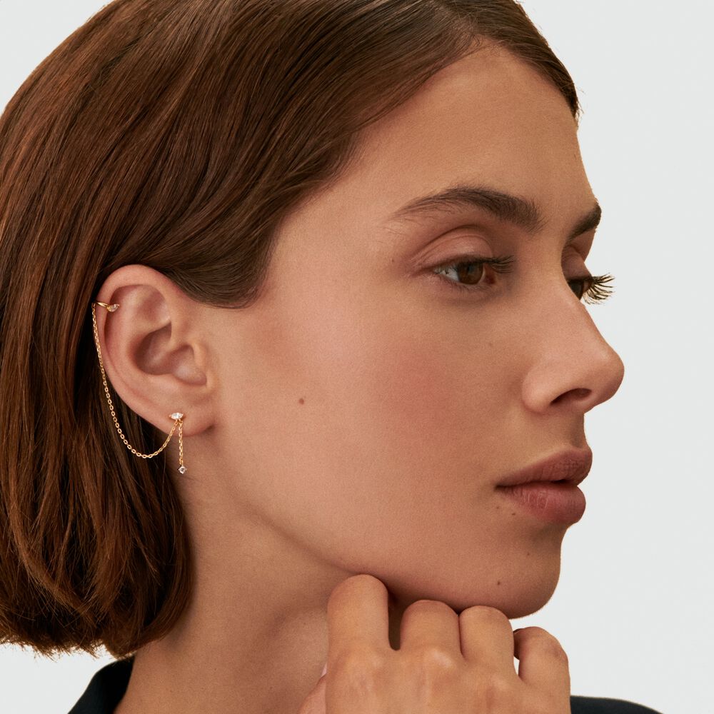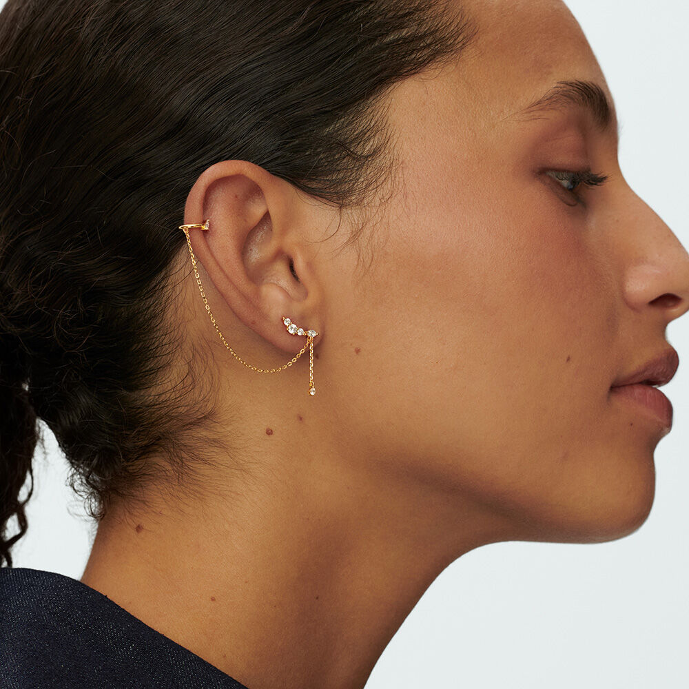 Earcuff, in fine gold plated sterling silver, cubic zirconia linked to a fake piercing by a chain. Sold by unit..