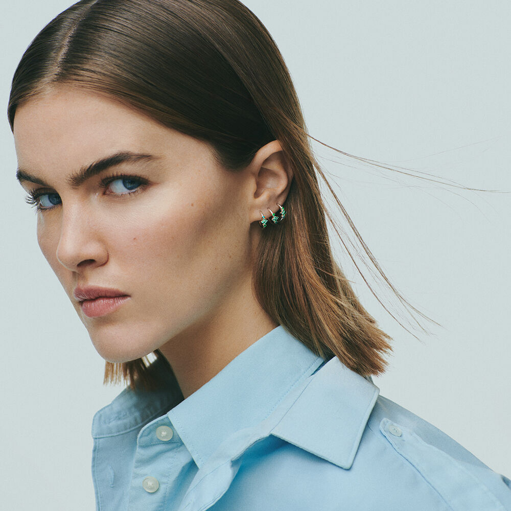 Hoop earrings in 925/1000 silver made of rows of flowers paved with cubic zirconia.