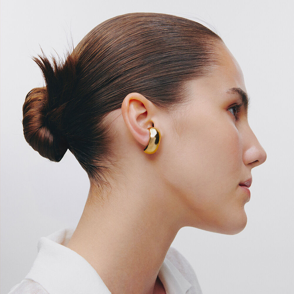 These earrings from our GRAND PALAIS collection, designed in Paris, are made from stainless steel. They are available in silver or gold color. They can be worn up or down for two different looks. They are inspired by generous volumes and full curves, for a look that is both bold and refined.