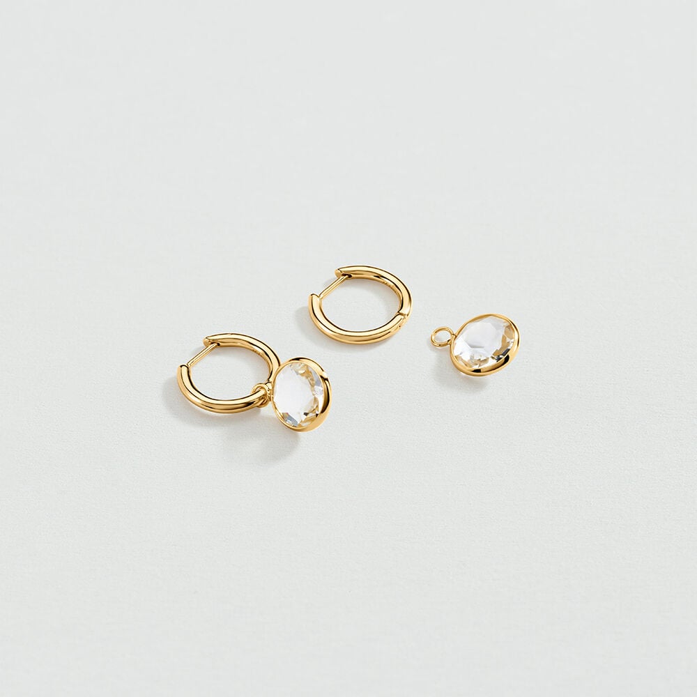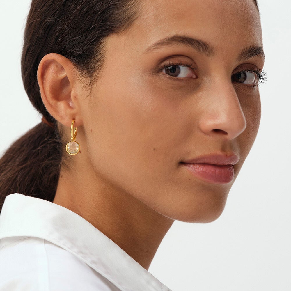 These earrings from our LUTETIA collection, designed in Paris, are made from brass gilded with 750/1000th - 18-carat gold and adorned with glass gems. They can be worn with or without the glass gems. Inspired by Agatha's archives, these earrings revisit the Art Deco style with a subtle play of transparency and XL sparkle, for a look that is both retro and resolutely modern.