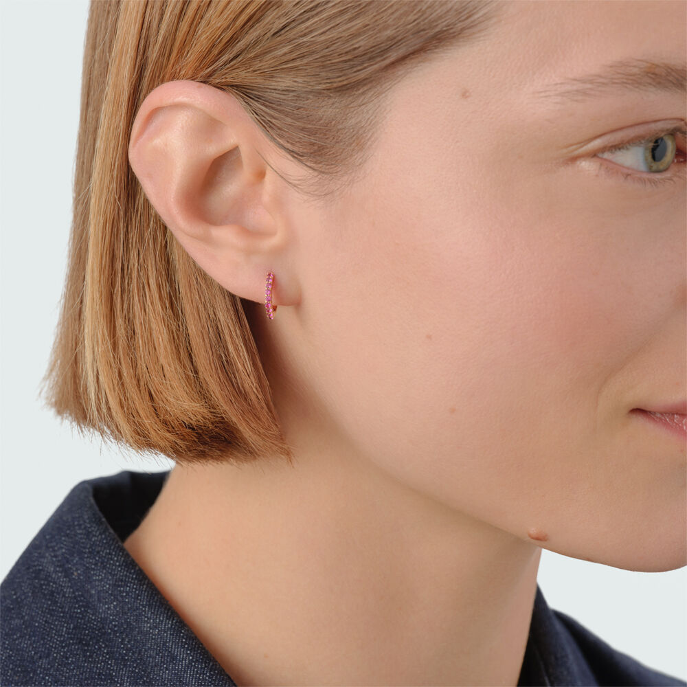 This hoop earring from our MIX & MATCH concept is made from 925 silver plated with 750/1000th - 18 carat gold and decorated with zirconium oxides. It is available in purple, green, pink, and crystal.Sold individually, so you can mix and match them.