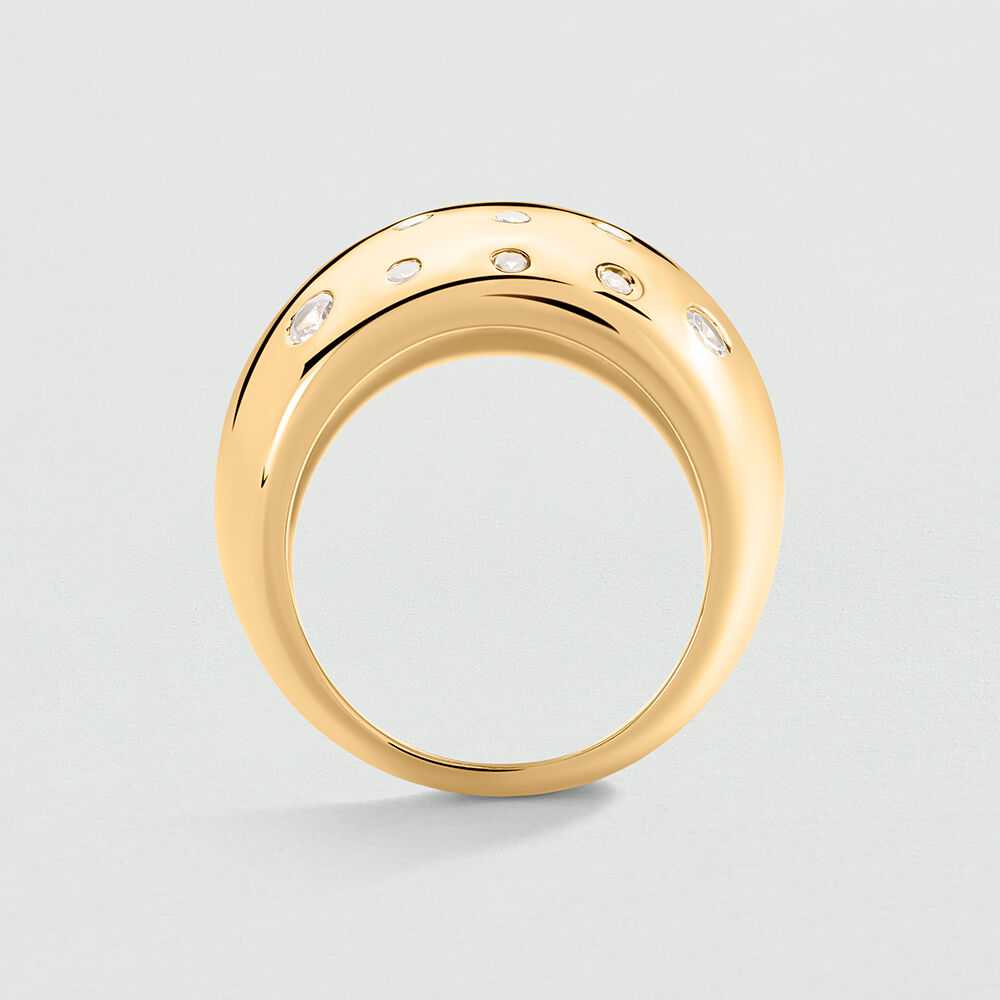 This ring from our DANAE collection, designed in Paris, is made from brass gilded with 750/1000 gold. It is available with or without zirconium oxides.This simple, refined ring can be adorned with oxides fused into the metal. It can be paired with other jewellery from our permanent DANAE collection.
