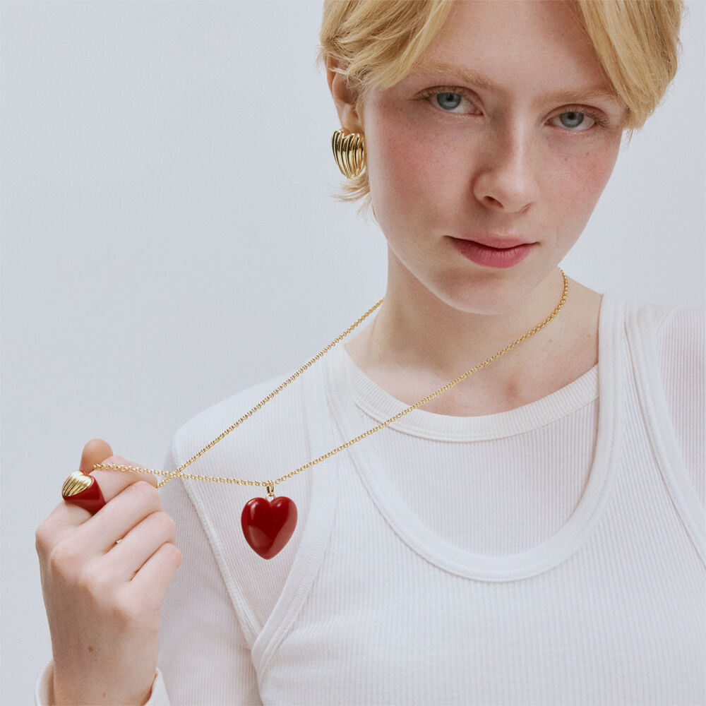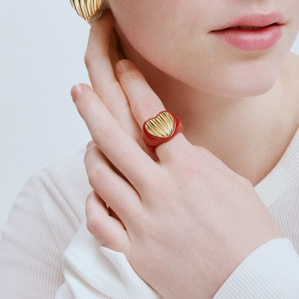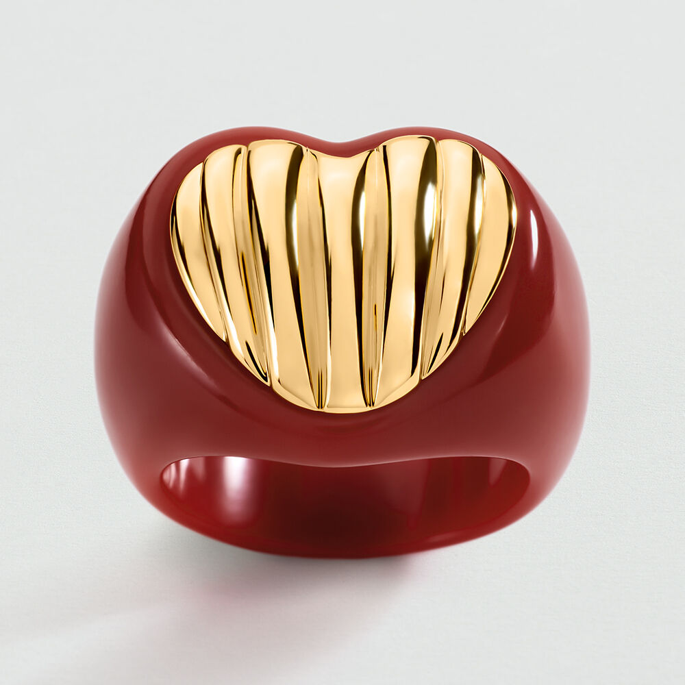 Ring with a striated metal heart from our SACRE COEUR collection, designed in Paris, made from brass gilded with 750/1000th - 18-carat gold and resin. It is available in ivory or red. The marbled appearance implies possible color variations from one model to another.