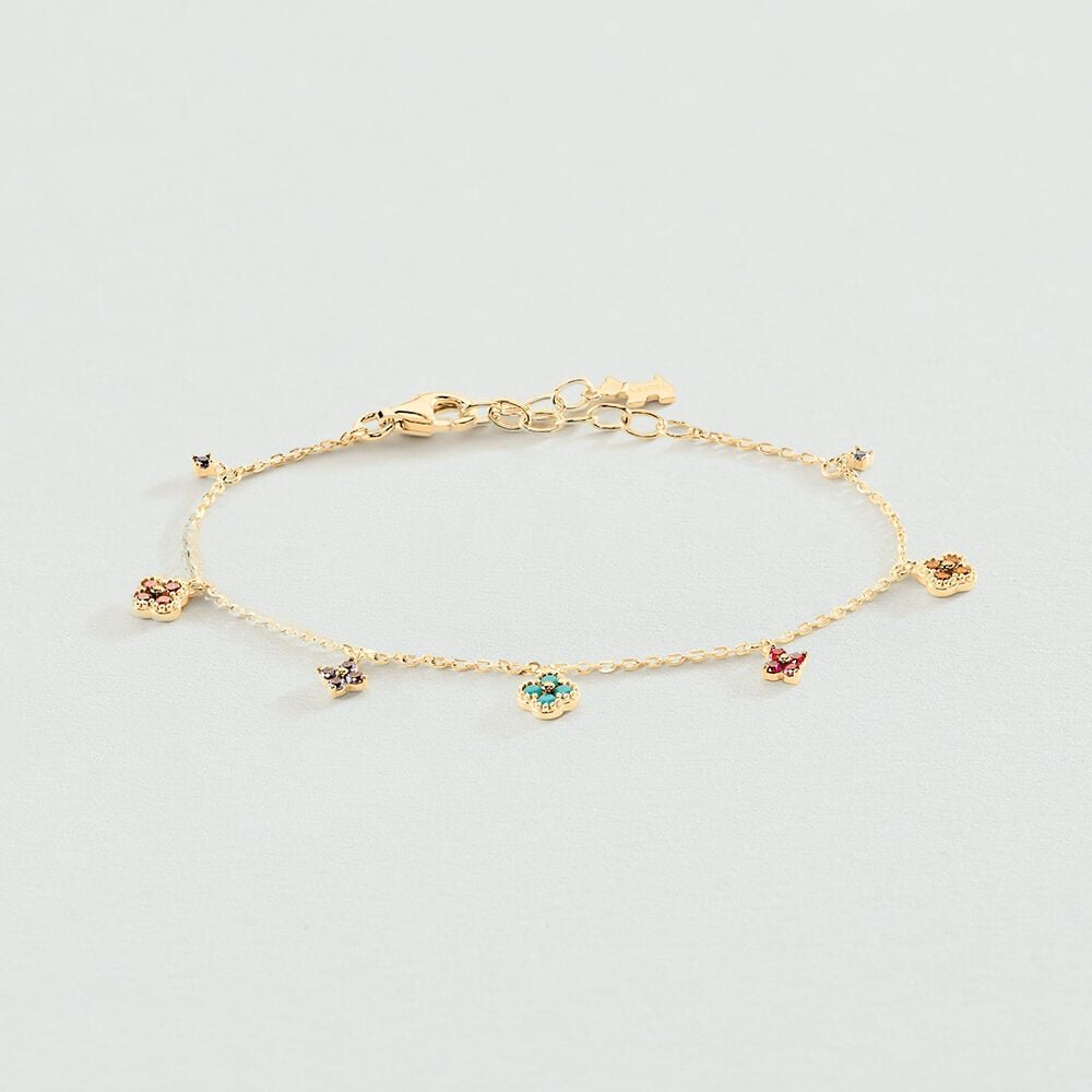 Chain bracelet, in sterling silver with gold plating, with flowers'charms, whose petals are with cubic zirconia and the edges with a thin milegrain. This piece of jewelry is 150mm long and comes with a 30mm extender