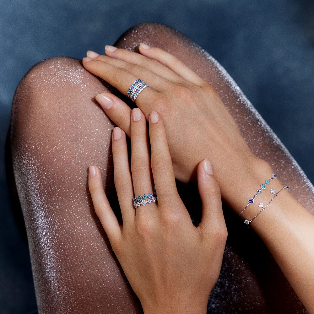 Bracelet in sterling silver with paved flowers.. This piece of jewelry is 150mm long and comes with a 30mm extender