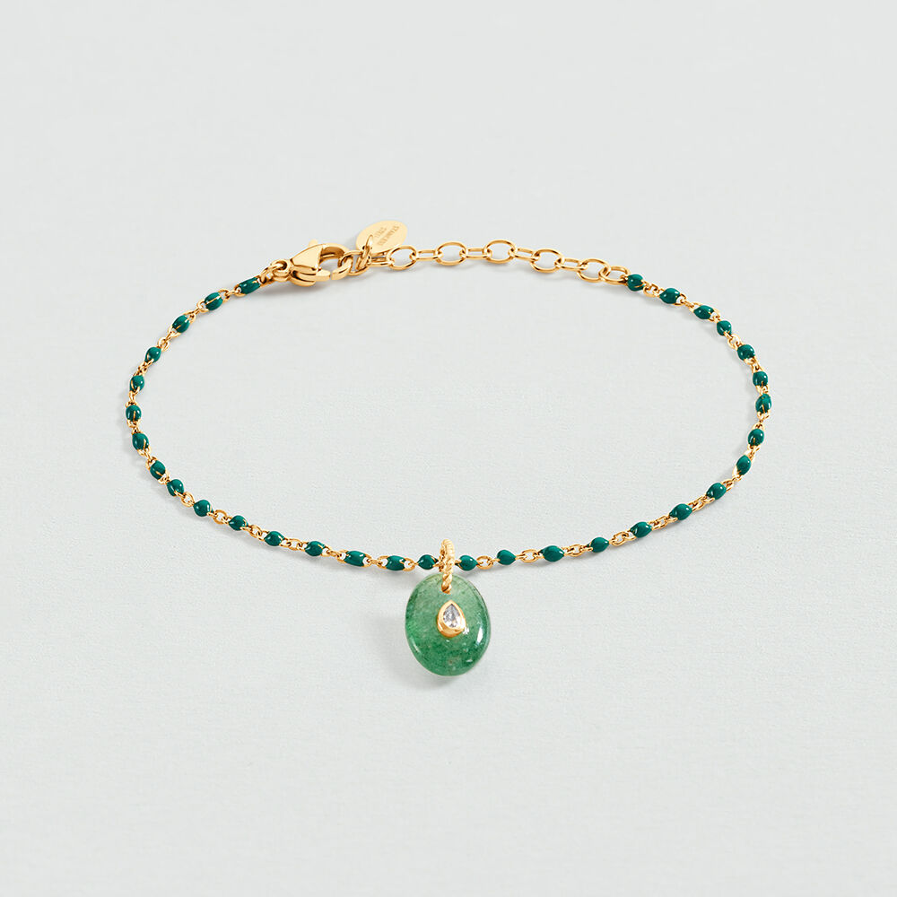 Gold-plated stainless steel bracelet with small colored enamel beads. It is available in black, green, white, coral, blue, burgundy, turquoise or silver/gold color. This piece of jewelry measures 150 mm and has an extender of 30 mm