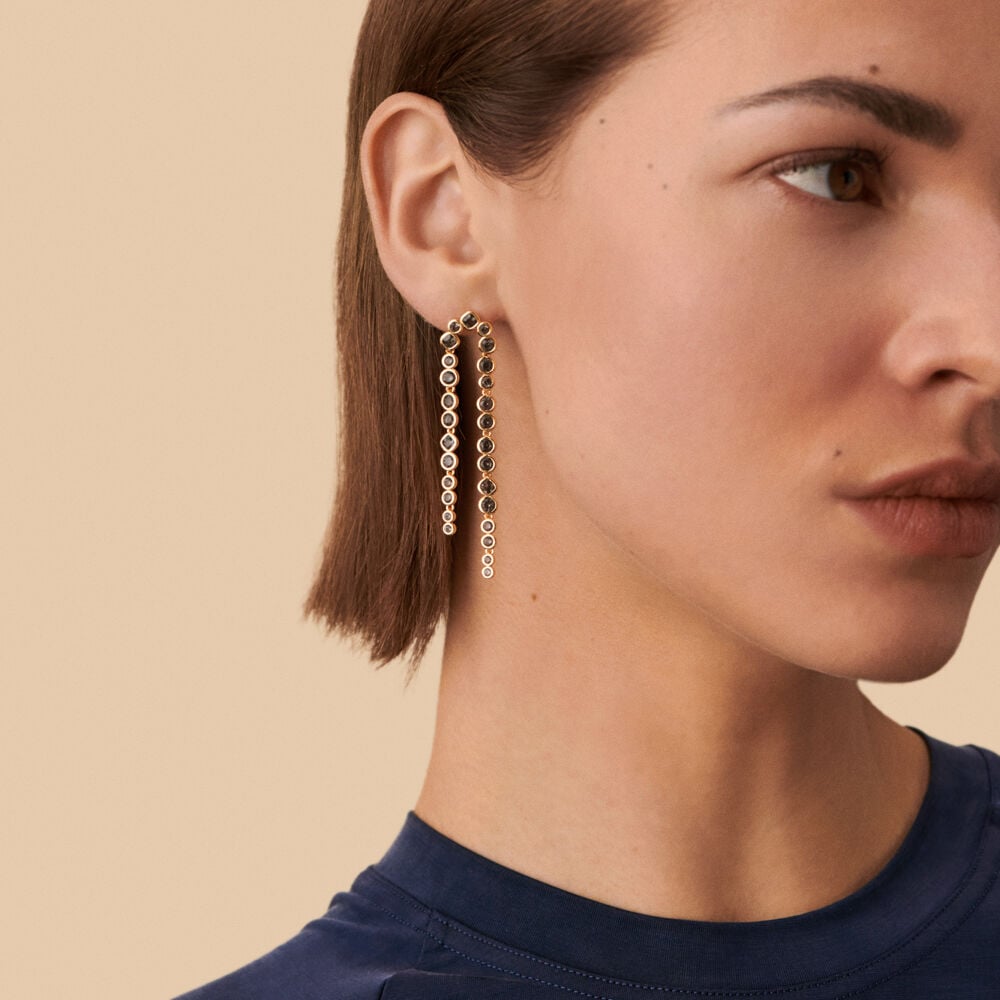 Long cascade earrings, in golden brass, tennis cubic zirconia chain.