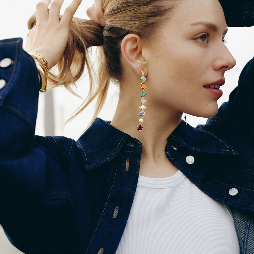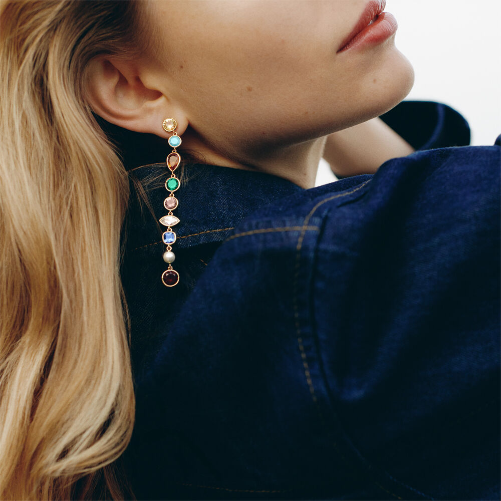 Long earrings in brass, gold-plated with 750/1000 gold, adorned with multicolored cubic zirconia.