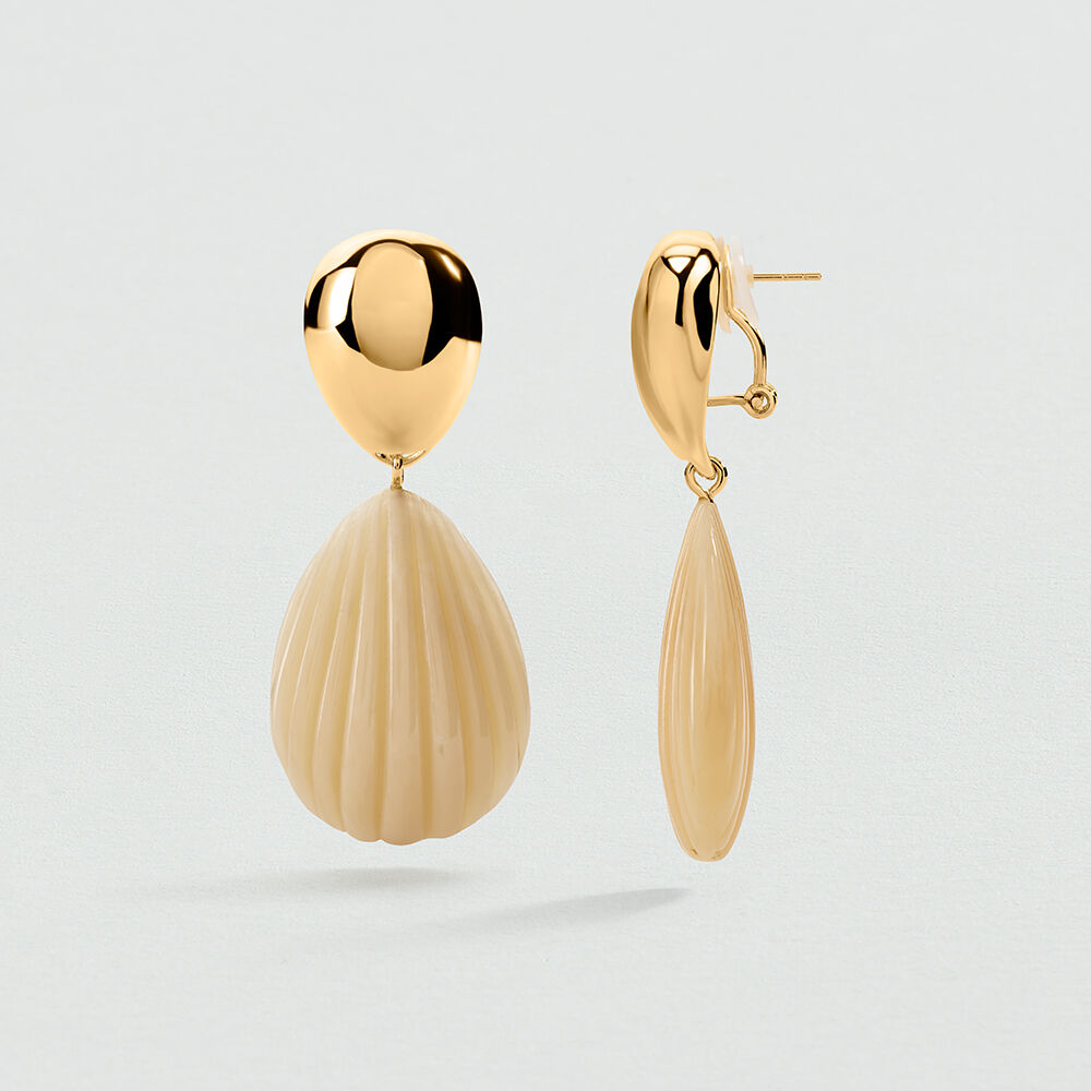 Double earrings from our MADELEINE collection, designed in Paris, made from 750/1000th - 18-carat gold-plated brass and striped resin. They are available in ivory or khaki. This timeless collection plays with very trendy seasonal colors. The marbled effect means that there may be slight variations in color from one model to another.