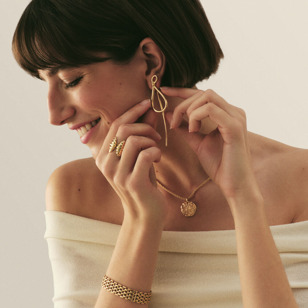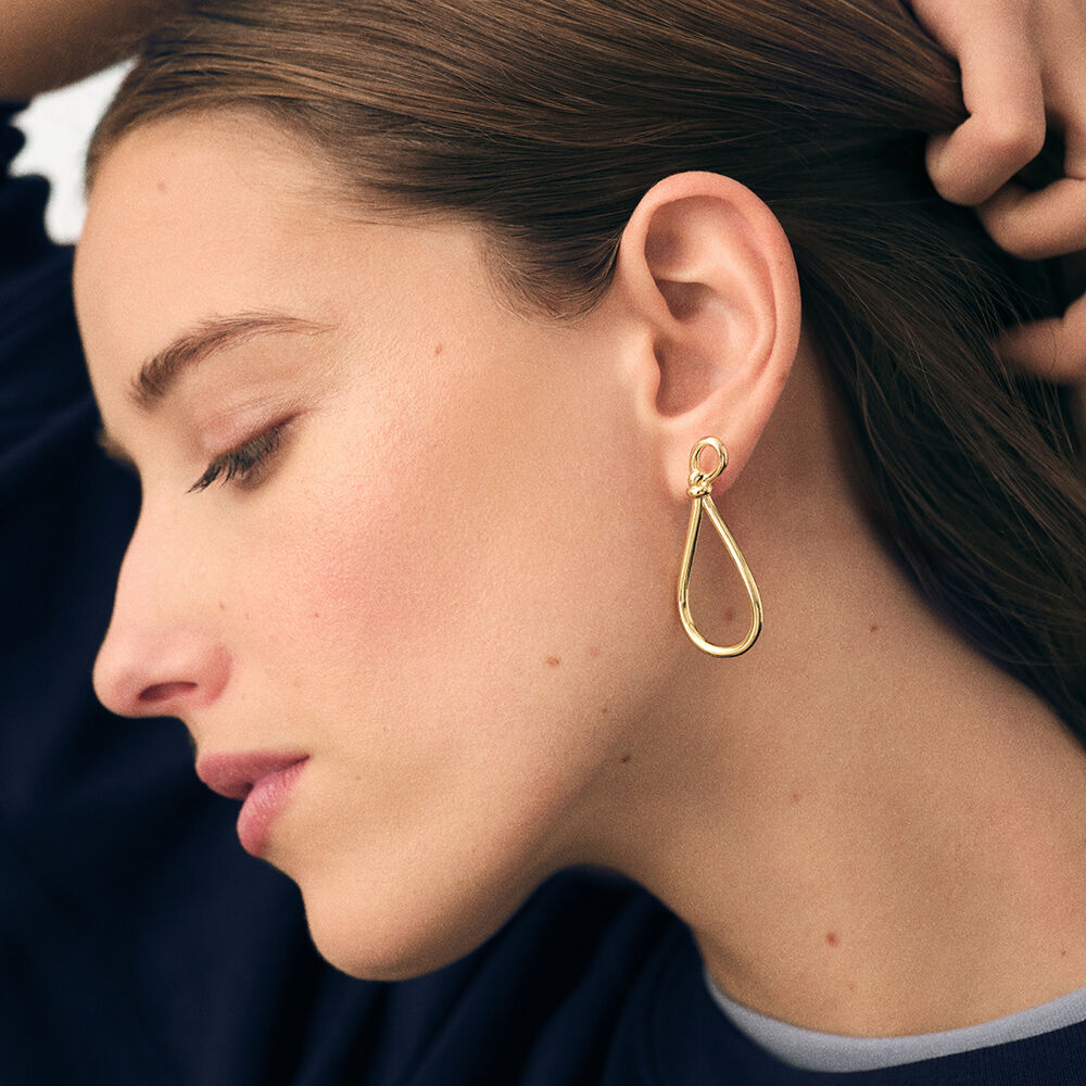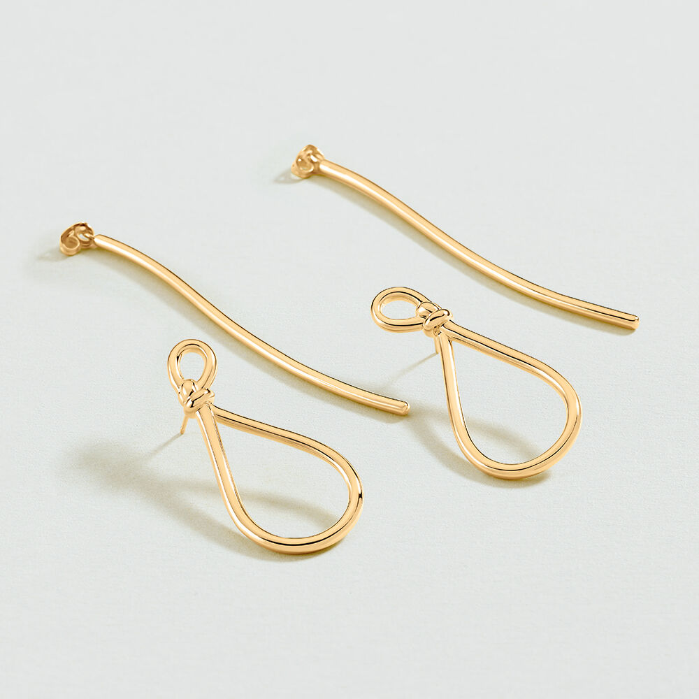 Long knotted earrings in brass, gold-plated with 750/1000 gold, can be worn with or without the back rod.