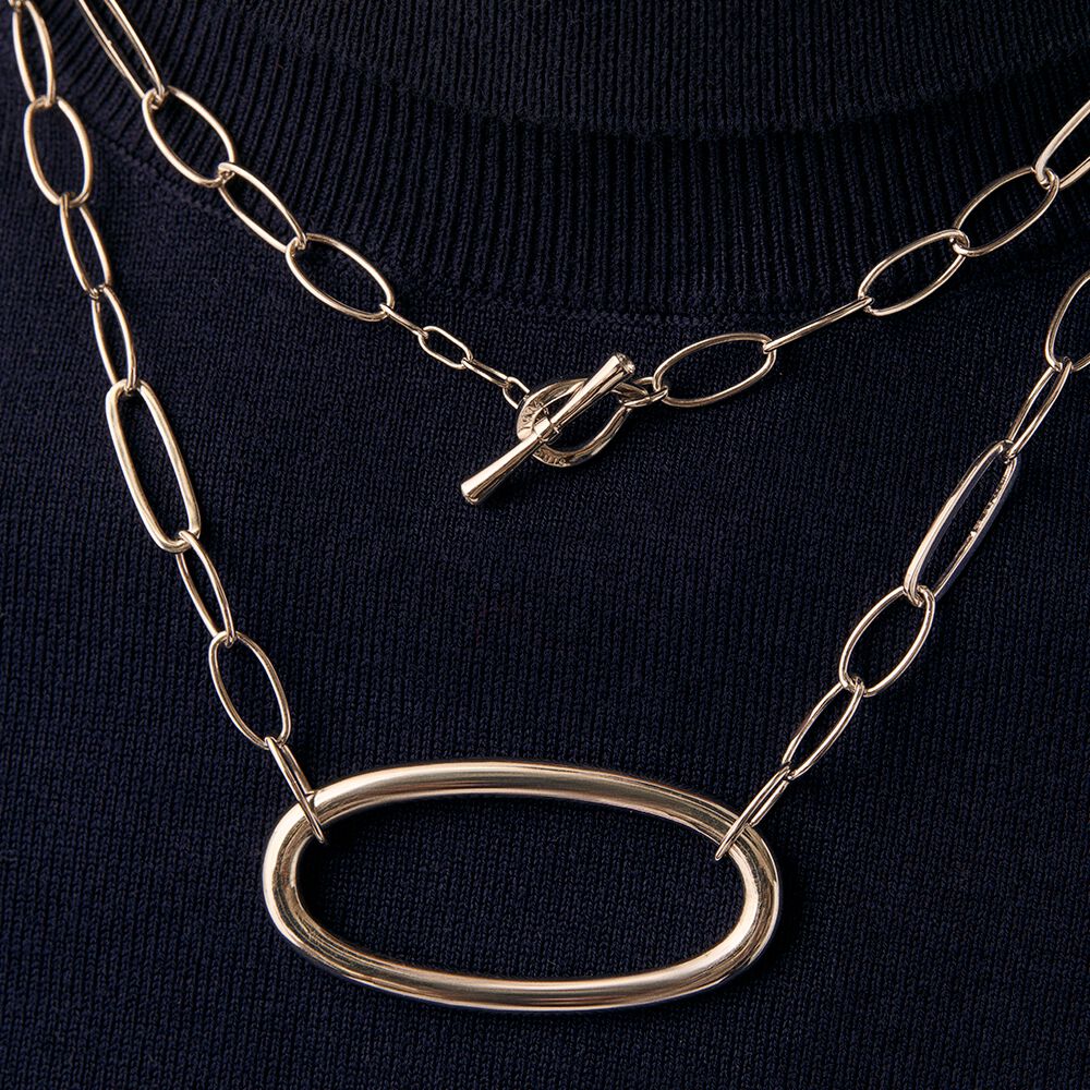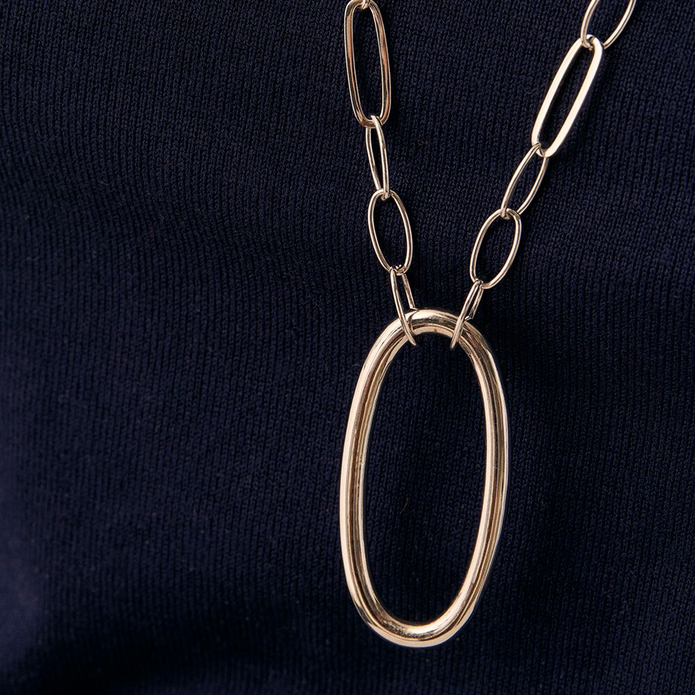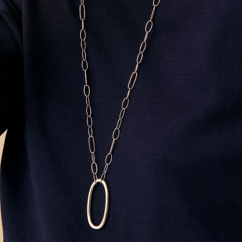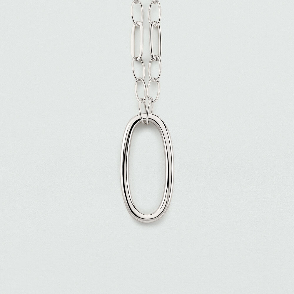Long necklace, in brass with rhodium, made with elongated links chain and among which, one of them is XL and worn as a pendant..