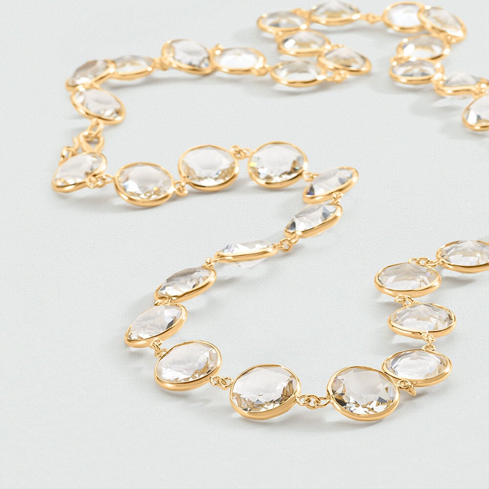 This necklace from our LUTETIA collection, designed in Paris, is made from 750/1000th - 18-carat gold-plated brass and adorned with glass gems. It can be worn single or double around the neck.Inspired by the Agatha archives, this necklace revisits the Art Deco style with a subtle play of transparencies and XL sparkles, for a look that is both retro and resolutely modern.