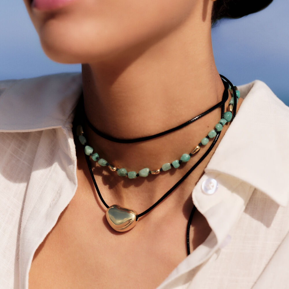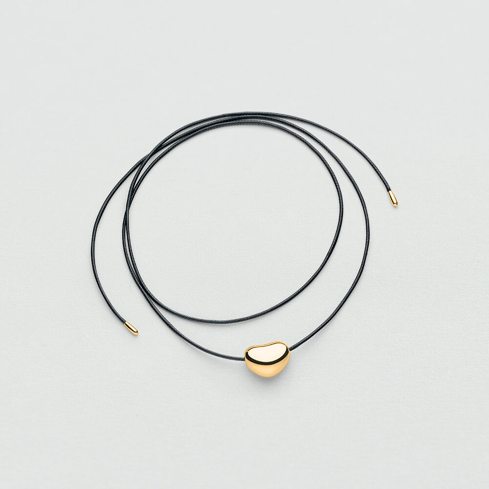 Long black cotton necklace with central organic pendant in gold-toned brass.Wear it in a single or double loop, knotted or not, this versatile piece adds a creative touch to any look.