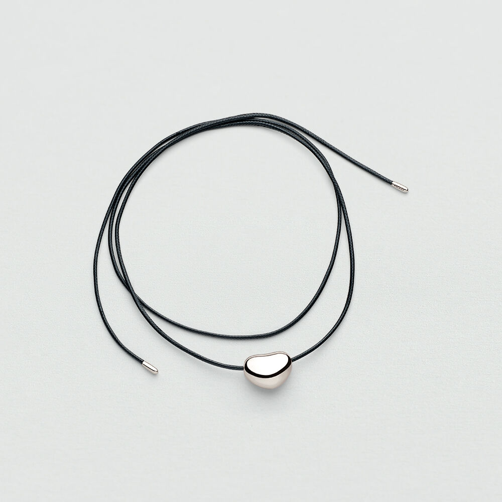 Long black cotton necklace with central organic pendant in rhodium-finished brass.Wear it in a single or double loop, knotted or not, this versatile piece adds a creative touch to any look.