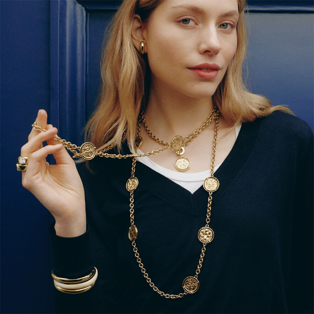 Long necklace in 750/1000 gold-plated tin, featuring pendants with two crossed keys on one side and a lunar cycle on the other, attached to a chain with a logo-engraved stick clasp. Made in our Parisian workshops, each piece of the St Honoré collection is meticulously designed, hand-sculpted, gold-plated using a traditional process, and then assembled by hand to ensure optimal quality and durability. A unique piece of jewelry that carries the heritage and timeless elegance of Agatha. The medals are 25 mm in diameter.