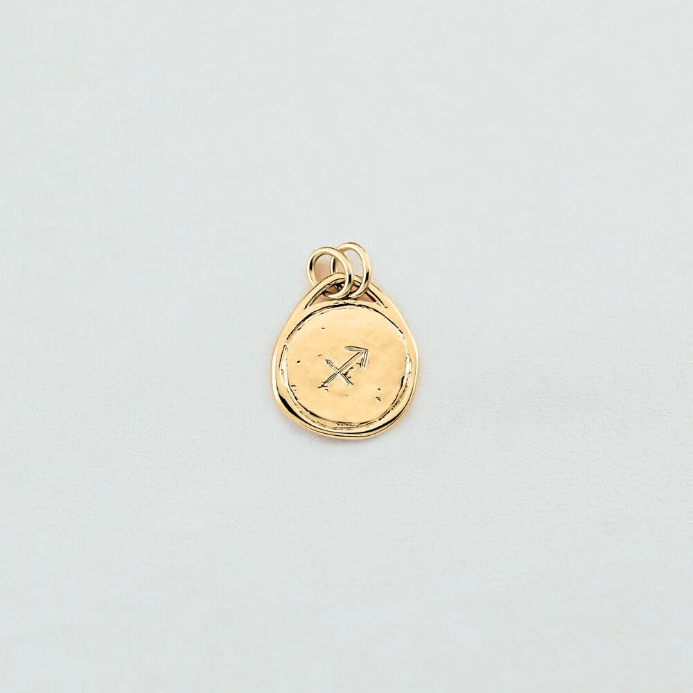 Sagittarius Zodiac Medal. Free-spirited and inspired, this French-made medal symbolizes Sagittarius’ quest for meaning. Hand-engraved on 18k gold-plated brass: a bow drawn to the stars, an arrow of truth.