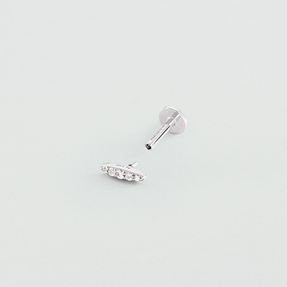 This stud piercing from our MIX & MATCH collection is crafted from rhodium-plated 925 sterling silver and adorned with cubic zirconia. The stud screws onto a 6mm post. The post and screw-on clasp are made of stainless steel, a metal particularly well-suited and recommended for cartilage piercings. This style can be worn on the lobe, helix, rook, or tragus. Sold individually, allowing you to mix and match them.