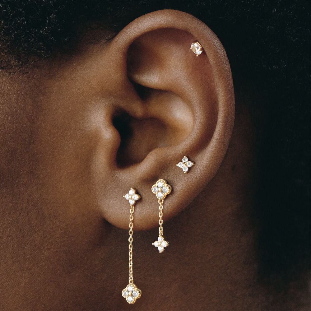Set of 3 earrings, in sterling silver with gold plating, of 3 different lenght, with flowers whose petals are with cubic zirconia and whose edges are with a thin milegrain.