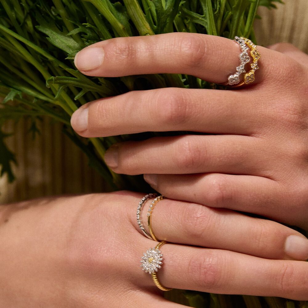 Thin ring in sterling silver plated with 750/1000 gold with paved flowers.