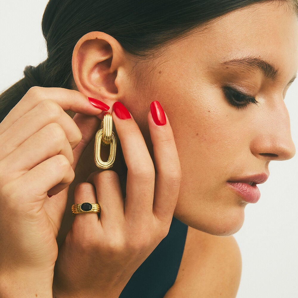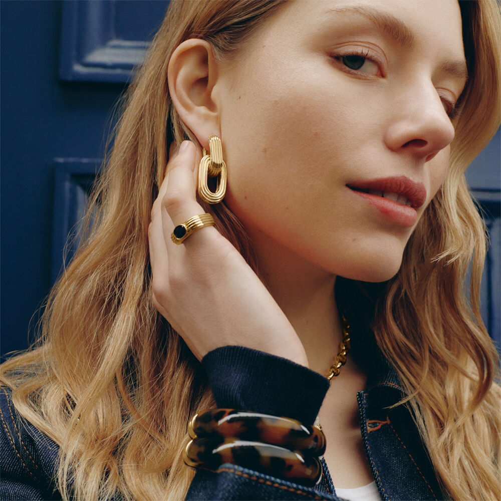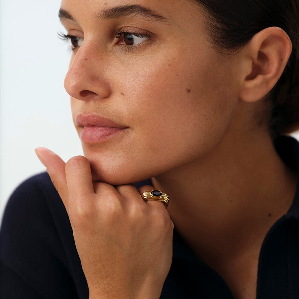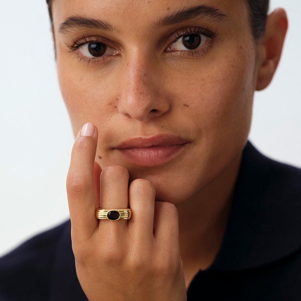 This ring from our HAUSSMANN collection, designed in Paris, is made of brass gilded with 750/1000th – 18-carat gold and adorned with zirconium oxides.This ring is part of Agatha's archive collection, inspired by the Art Deco universe. Its striated texture and trendy look will enhance your outfits.